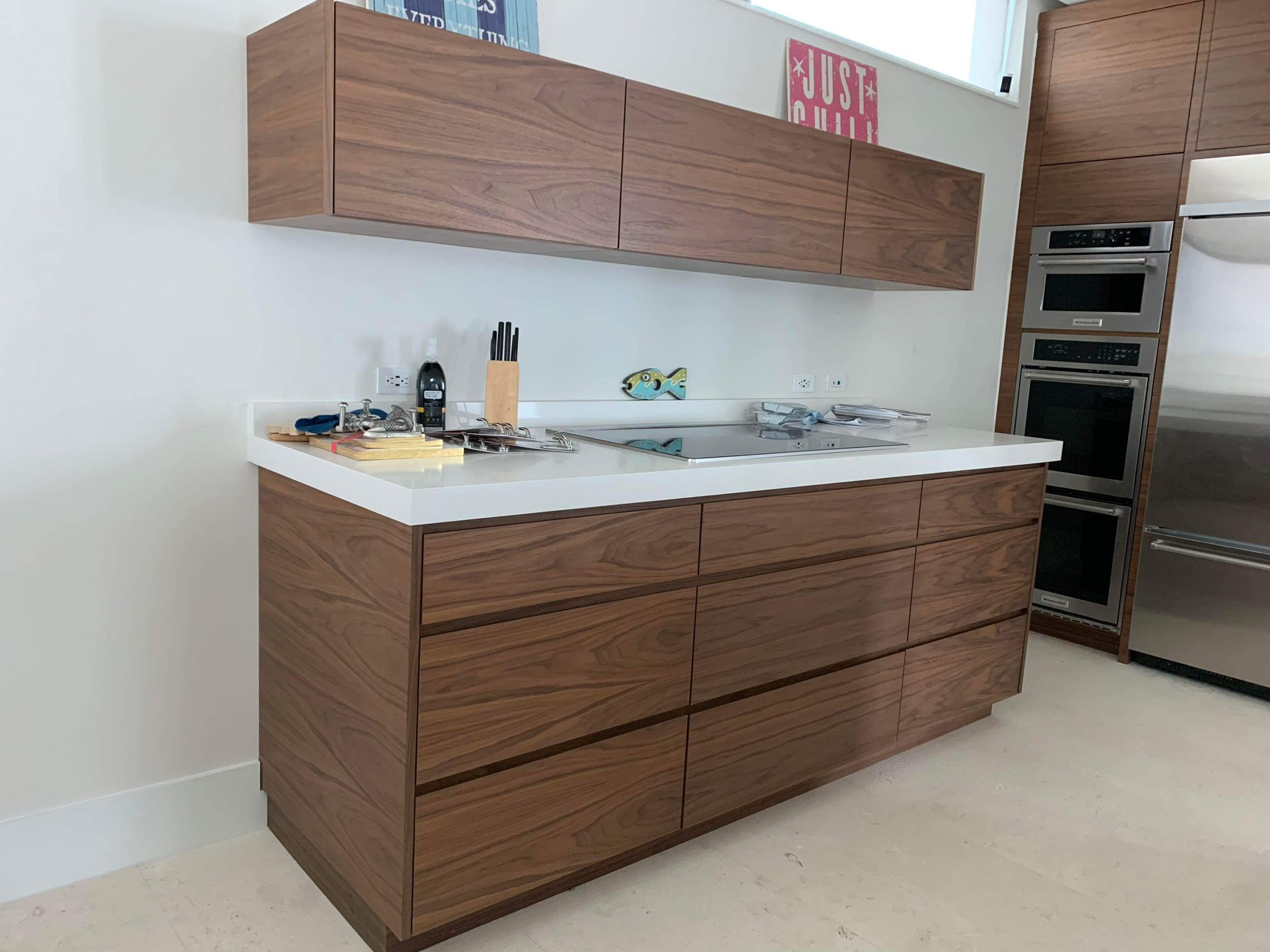 The handleless drawers, clean finishes, and linear design create a refined and modern atmosphere, while the natural wood brings warmth and character to the space. Every module was thoughtfully designed to optimize storage, workflow, and visual harmony—delivering a durable and elegant result that enhances everyday living.