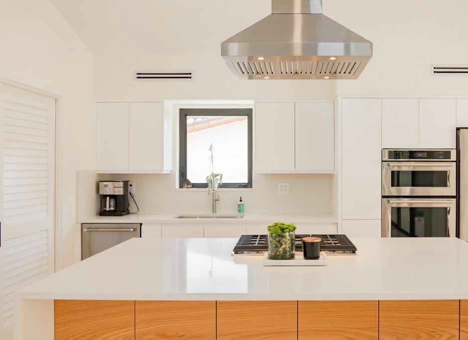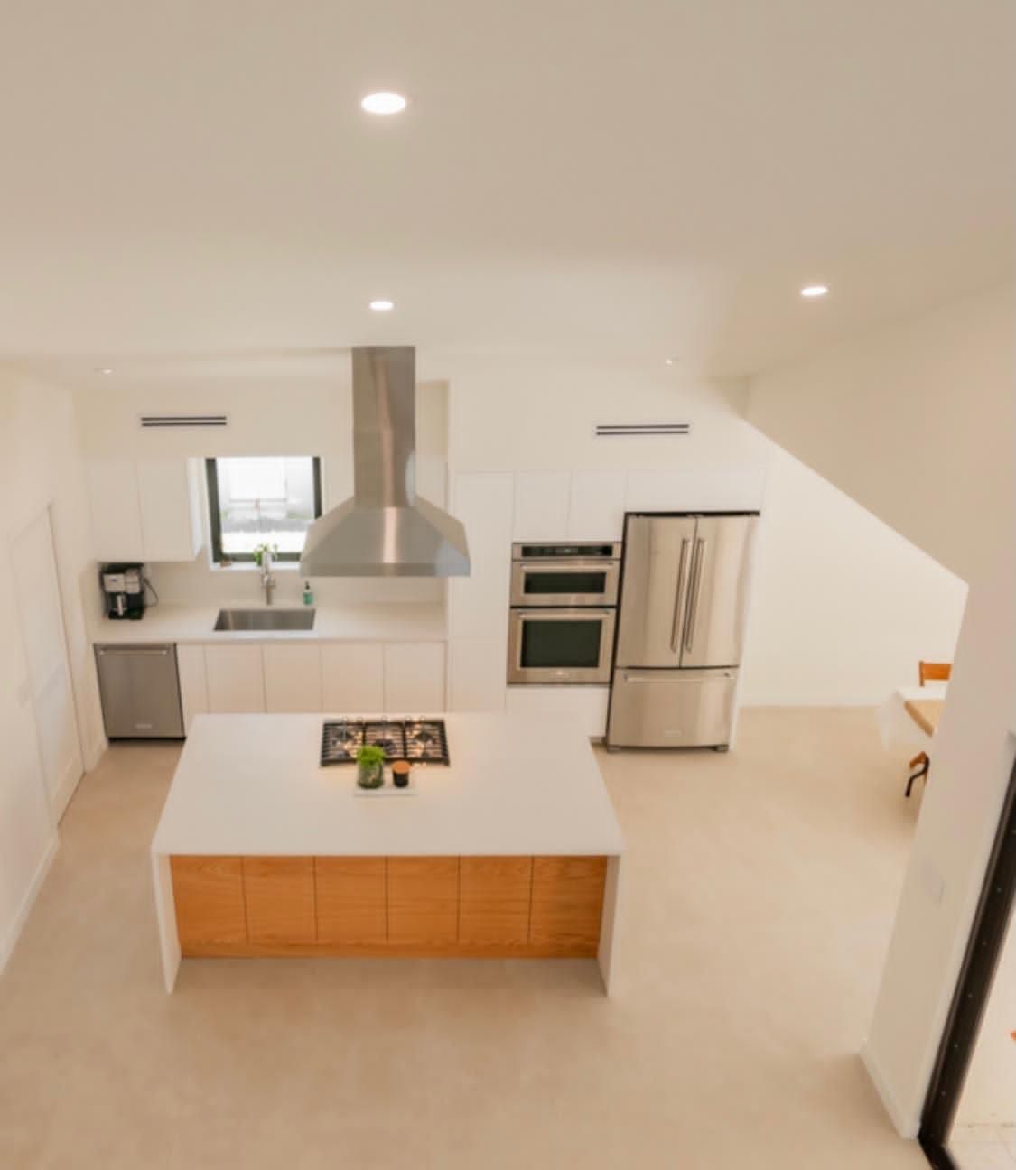 The cabinetry offers handle-free doors for a smooth, modern appearance, complemented by high-end stainless steel appliances and a prominent ceiling-mounted range hood that adds a touch of industrial elegance. Natural light floods the area through large openings, highlighting the soft color palette and flawless detailing of the custom millwork.